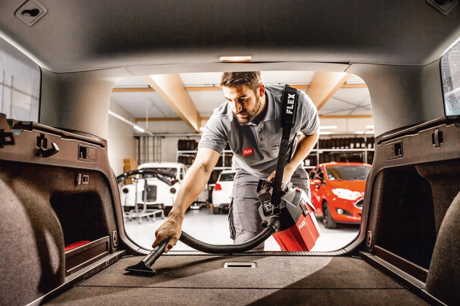 Krachtige stofzuiger voor professioneel gebruik bij de eindmontage, voertuigreiniging enz. Eenvoudige aansluiting van elektrische gereedschappen van FLEX met het FLEX-clipsysteem voor afzuigwerkzaamheden
