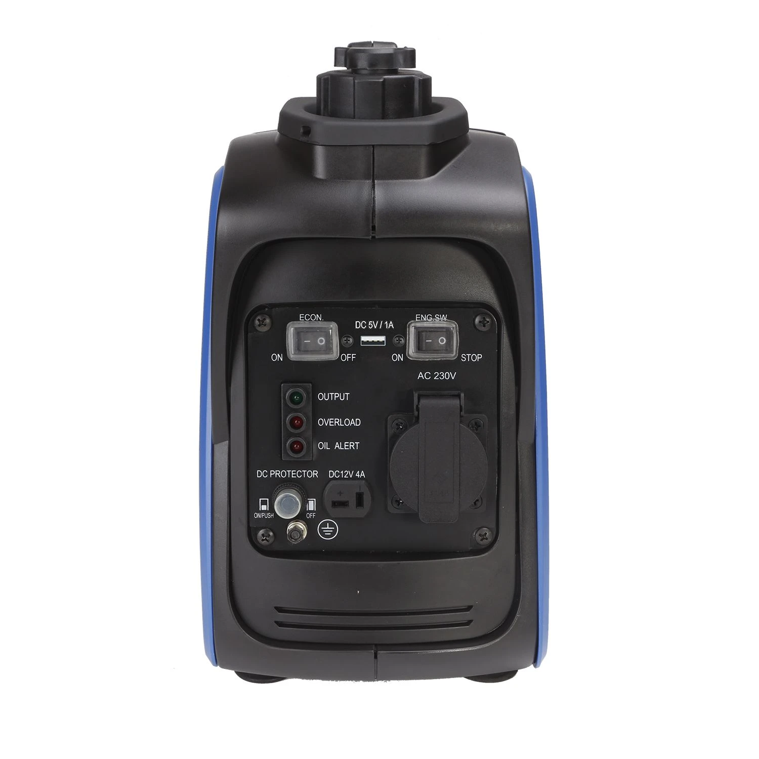 Deze lichte en compacte Hyundai draagbare invertergenerator is met name geschikt voor caravans en campers waarmee zowel tv’s, verlichting en laptops kunnen worden aangestuurd en is tevens geschikt voor het laden van telefoons en accu’s. De 4 takt 40 cc motor produceert stroom met een zuivere sinusgolf van max. 800 Watt en een continu output van 700 Watt. Op een gevulde (Euro 95/E5) benzine tank (2.1Ltr.) loopt de inverter-motor > 4 uur. De inverter heeft een automatische uitschakeling als het oliepeil onder de veilige limiet daalt om schade te voorkomen. Deze inverter is voorzien van de nieuwste techniek, het toerental wordt automatisch geregeld door de afname watts, de inverter is enorm stil en produceert slechts 58 dB (op 7 meter afstand). De inverter heeft zowel een 230V AC als 12V DC uitgang, ook beschikt deze over anti-slip poten waardoor je hem overal stabiel kunt plaatsen.